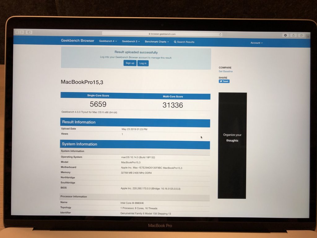Vi har testat datorn i Geekbench för att jämföra med föregående års resultat på modellen med 6-core i9 och Radeon 560X grafikkort. Där kan vi direkt se att multi-core prestandan ökat rejält.