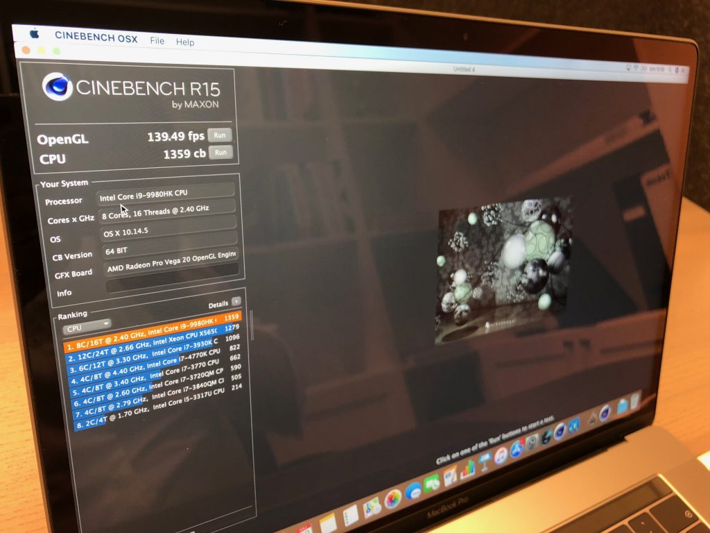 När vi testar datorn i Maxon Cinebench R15 får den 139 fps på OpenGL testet jämfört med 105 fps på föregående modell, samt 1359 cb jämfört med 896 cb på föregående modell. Det är en rejäl ökning! Här får man tänka på att det starkare Vega 20 grafikkortet också spelar in.