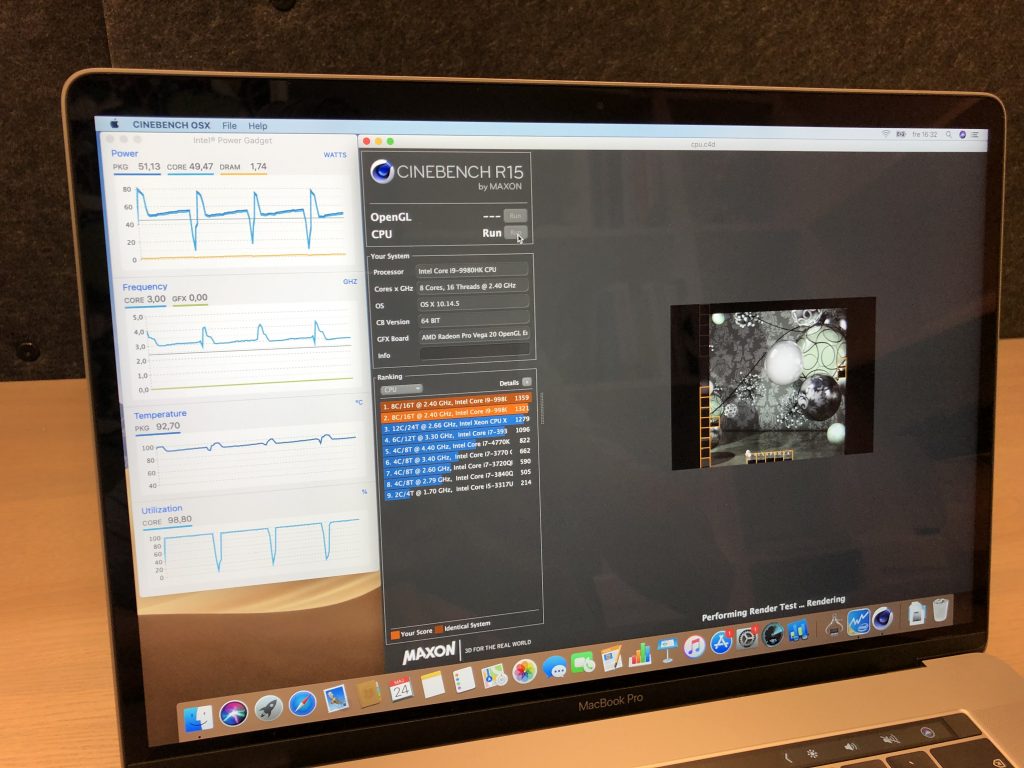 Vi testade även ”thermal throttling” genom att pusha datorn med Cinebench:s CPU-test 15 gånger i rad. 2.4GHz 8-core Processorn dök knappt under 3.0ghz någon gång. CPU användning var ca 99% och den blev ca 93C varm. Fläktarna gick nog fullt men lät inte så högt som på vissa pc modeller. Vår slutsats är att denna dator verkar klara av hög belastning galant utan att ”throttla” ner processorn till lägre hastigheter.